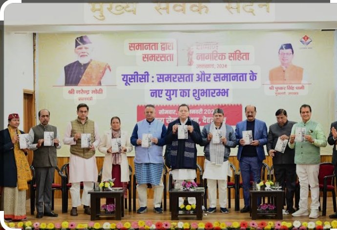 27 जनवरी को मनाया जायेगा यूसीसी दिवसः मुख्यमंत्री पुष्कर सिंह धामी ने घोषणा की है कि अब प्रदेश में प्रति वर्ष 27 जनवरी को समान नागरिक संहिता दिवस के रूप में मनाया जाएगा। उन्होंने कहा कि धारा 370, तीन तलाक, राम मंदिर को लेकर जितने भी संकल्प लिये गये थे, वे प्रधानमंत्री नरेंद्र मोदी के नेतृत्व में पूरे किये गये हैं। इस अवसर पर यूसीसी नियमावली समिति के अध्यक्ष शत्रुघ्न सिंह ने यूसीसी नियमावली के बारे में विस्तार से जानकारी दी जबकि सचिव शैलेश बगोली ने धन्यवाद ज्ञापन दिया। इस मौके पर कैबिनेट मंत्री प्रेमचंद अग्रवाल, गणेश जोशी, सुबोध उनियाल, रेखा आर्य, सौरभ बहुगुणा, राज्यसभा सांसद और भाजपा प्रदेश अध्यक्ष महेंद्र भट्ट, राज्यसभा सांसद नरेश बंसल, विधायकगण, मुख्य सचिव राधा रतूड़ी, यूसीसी नियमावली समिति के सदस्य शत्रुघ्न सिंह, प्रो. सुरेखा डंगवाल, मनू गौड़, अजय मिश्रा, शासन और पुलिस के वरिष्ठ अधिकारी उपस्थित थे।