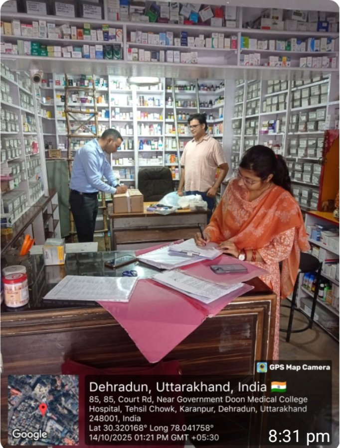 वहीं जनपद हरिद्वार के रुड़की क्षेत्र में औषधि निरीक्षक श्री हरीश सिंह एवं श्रीमती मेघा द्वारा गुप्त सूचना के आधार पर एम/एस फलख नाज़ (ग्राम सलीयर) में छापेमारी की गई। इस दौरान बिना लाइसेंस के सरकारी दवाओं का अवैध भंडारण व बिक्री करते हुए पाया गया। टीम ने मौके से 12 प्रकार की एलोपैथिक दवाएं जब्त कीं, जिनमें राजस्थान व मध्यप्रदेश सरकार की सप्लाई की गई औषधियां भी सम्मिलित थीं। सभी दवाएं मौके पर सील कर फार्म 17–17ए के अंतर्गत जांच हेतु नमूने लिए गए। आगे की कार्रवाई Drugs and Cosmetics Act, 1940 के अंतर्गत की जाएगी।
