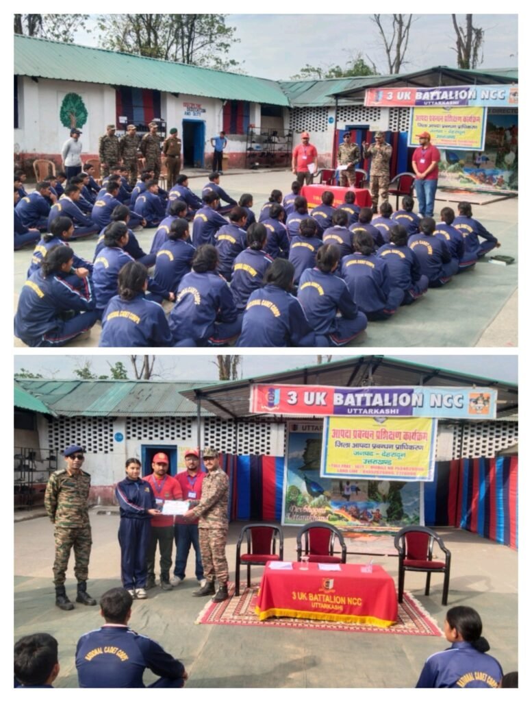 प्रशिक्षण कार्यक्रम के समापन अवसर पर ओल्ड बुचडी गढ़ी कैंट, देहरादून में आयोजित समारोह के दौरान कर्नल मानोष दास, कमान अधिकारी 03 यूके बटालियन एनसीसी, द्वारा सभी प्रशिक्षणार्थी कैडेट्स को प्रमाण पत्र वितरित किए गए। इस अवसर पर कमान अधिकारी द्वारा जिलाधिकारी महोदय एवं अपर जिलाधिकारी महोदय (वि0/रा0), देहरादून का विशेष आभार व्यक्त करते हुये कि इस प्रकार के प्रशिक्षण कार्यक्रम युवाओं में आपदा के प्रति जागरूकता, अनुशासन, नेतृत्व क्षमता एवं सेवा भावना का विकास करते हैं तथा उन्हें किसी भी आपात स्थिति में प्रशासन के साथ समन्वय स्थापित कर कार्य करने हेतु सक्षम बनाते हैं। प्रशिक्षण के माध्यम से कैडेट्स को एक सशक्त, प्रशिक्षित एवं जिम्मेदार “आपदा मित्र” के रूप में तैयार किया गया है। कार्यक्रम के अंत में सभी कैडेट्स के उज्ज्वल भविष्य की कामना करते हुए प्रशिक्षण कार्यक्रम को सफल घोषित किया गया। इस अवसर पर भारतीय सेना की ओर से एडम ऑफिसर लेफ्टिनेंट कर्नल लोक बहादुर मल्ल, कैंप सूबेदार ललित सिंह, प्रशिक्षण जेसीओ नायब सूबेदार मेहरबान सिंह, श्री सुशील सिंह कैन्तुरा एवं श्री किशन राजगुरू, मास्टर टेªनर, युवा आपदा मित्र आदि उपस्थित रहे।