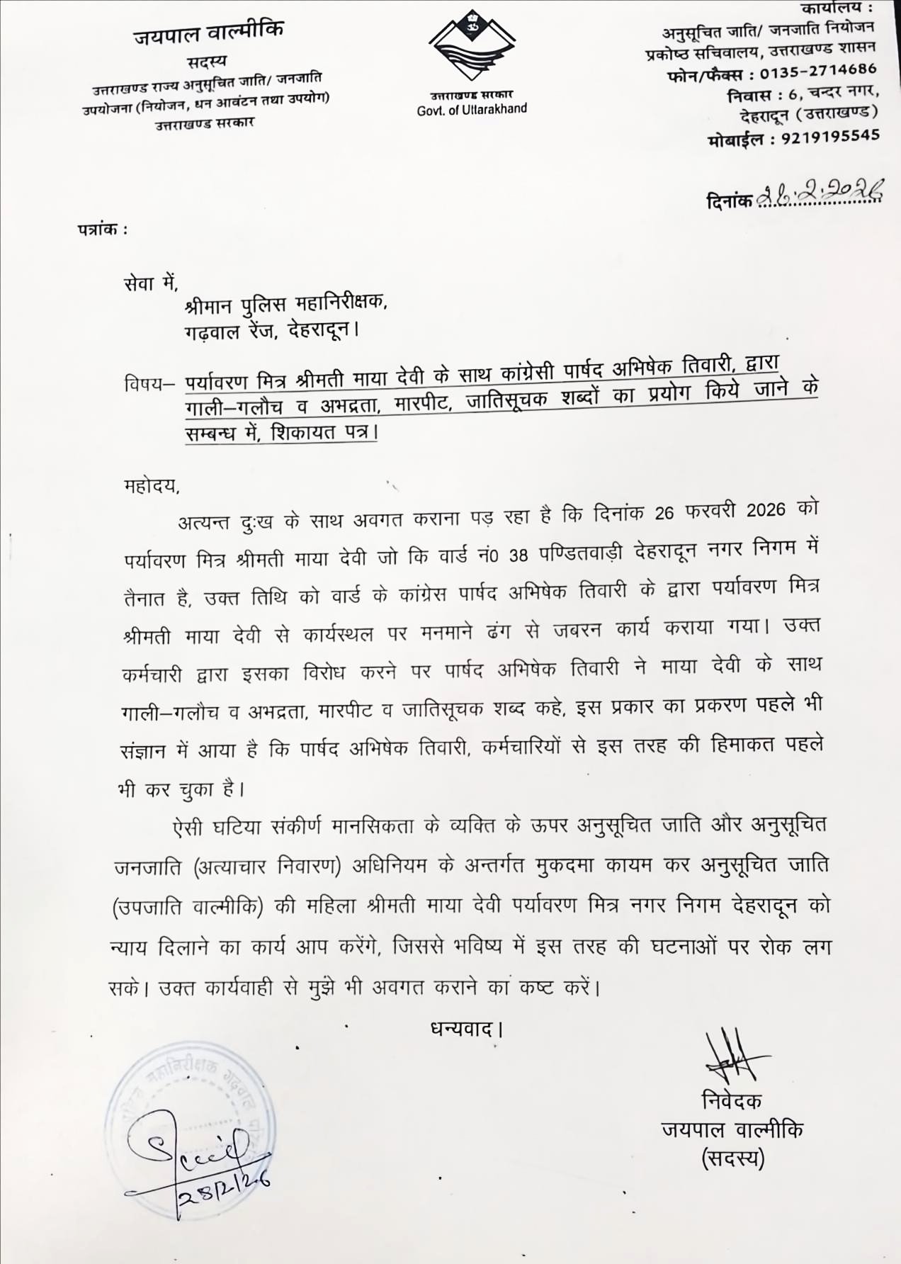 पुलिस में मामला दर्ज कराते हुए जयपाल बाल्मीकि ने आरोप लगाया गया है कि है कि वार्ड नं0 38 पण्डितवाड़ी देहरादून नगर निगम के कांग्रेस पार्षद अभिषेक तिवारी के द्वारा पर्यावरण मित्र माया देवी पर सख्ती करते हुए कार्यस्थल पर मनमाने ढंग से जबरन कार्य कराया गया। उक्त कर्मचारी द्वारा इसका विरोध करने पर पार्षद अभिषेक तिवारी ने माया देवी के साथ गाली-गलौच व अभद्रता, मारपीट व जातिसूचक शब्द कहे, इस प्रकार का प्रकरण पहले भी संज्ञान में आया है कि पार्षद अभिषेक तिवारी, कर्मचारियों से इस तरह की हिमाकत पहले भी कर चुका है।